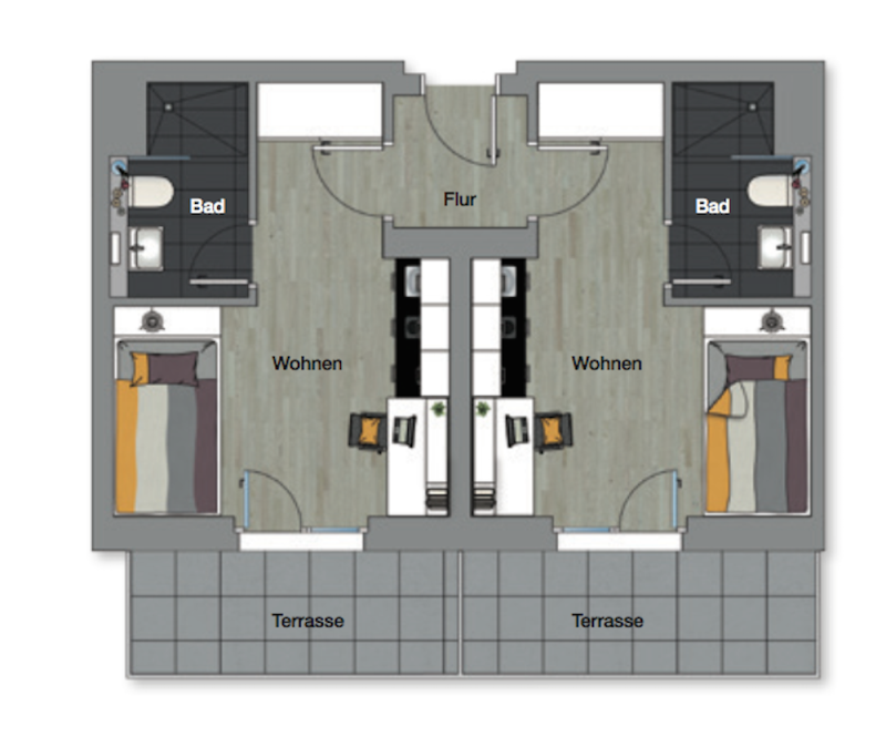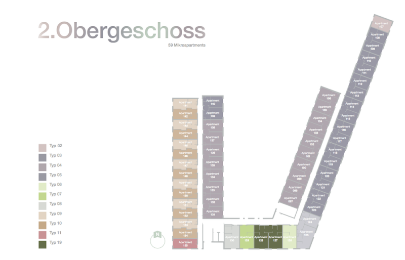 Die Appartements werden eine Größe von ca. 18 bis 35 qm besitzen. Alle Mikroappartements werden mit Bett, Schrank und Schreibtisch ausgestattet sein. Ein modernes Badezimmer sowie eine Pantry-Küche mit Kochfeld und Kühlschrank werden in den Einzelzimmern und Doppelzimmern ihren Platz finden. Alle Appartements in dem Studentenwohnheim verfügen über Highspeed-Internet und Kabel-TV. Einige der Studentenappartements werden mit einer Terrasse oder Dachterrasse verbunden sein. Weiterhin wird ein großzügiger Fahrradkeller vorhanden sein. Tiefgaragenplätze werden ebenfalls zur Verfügung stehen. .