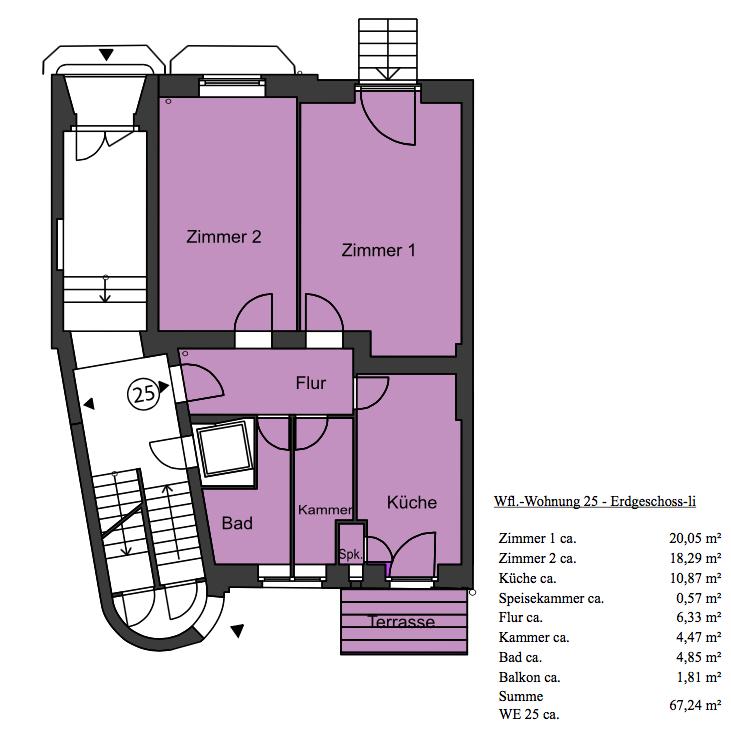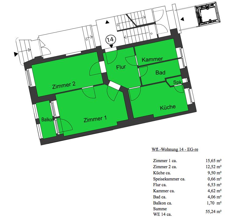 Die bereits vermieteten Bestandswohnungen sind in einem gepflegten Zustand und sind außerhalb der sanitären Bereiche überwiegend mit Dielen oder Fischgrätenparkett ausgestattet. Ca. im Jahr 2000 wurden die Sprossenfenster erneuert.