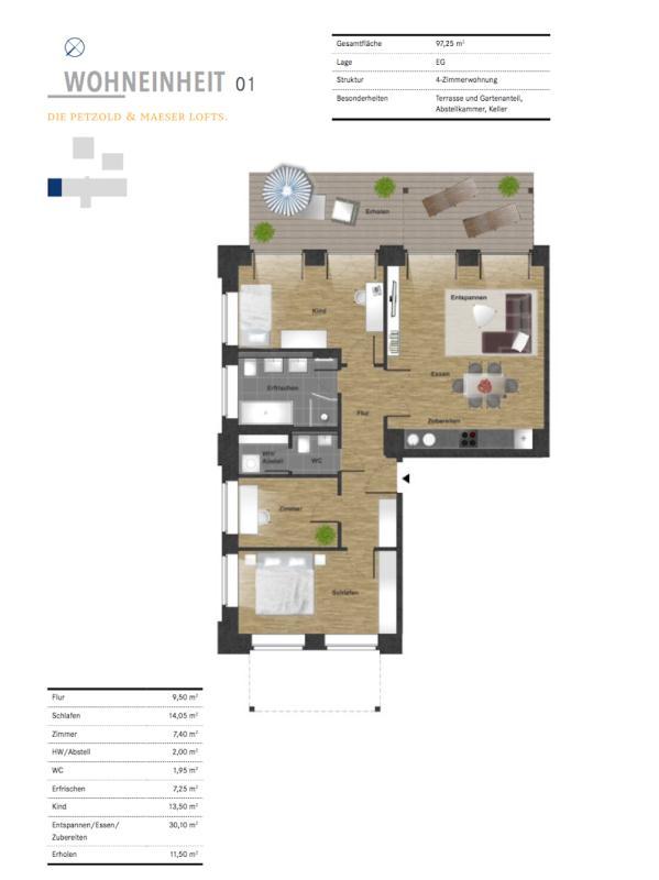 Die neugestaltete Außenanlage wird sich in das moderne Erscheinungsbild der Knopffabrik perfekt einfügen. Neben den Grünflächen werden unteranderem eine gemütliche Sitzecke, ein Kinderspielplatz und PKW- und Fahrradstellplätze geschaffen.